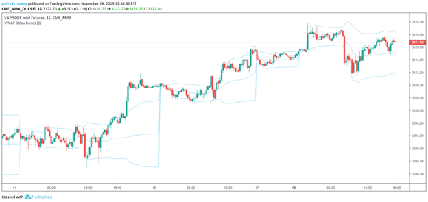 VWAP with 2 standard deviation bands applied to the 15-minute chart of /ES