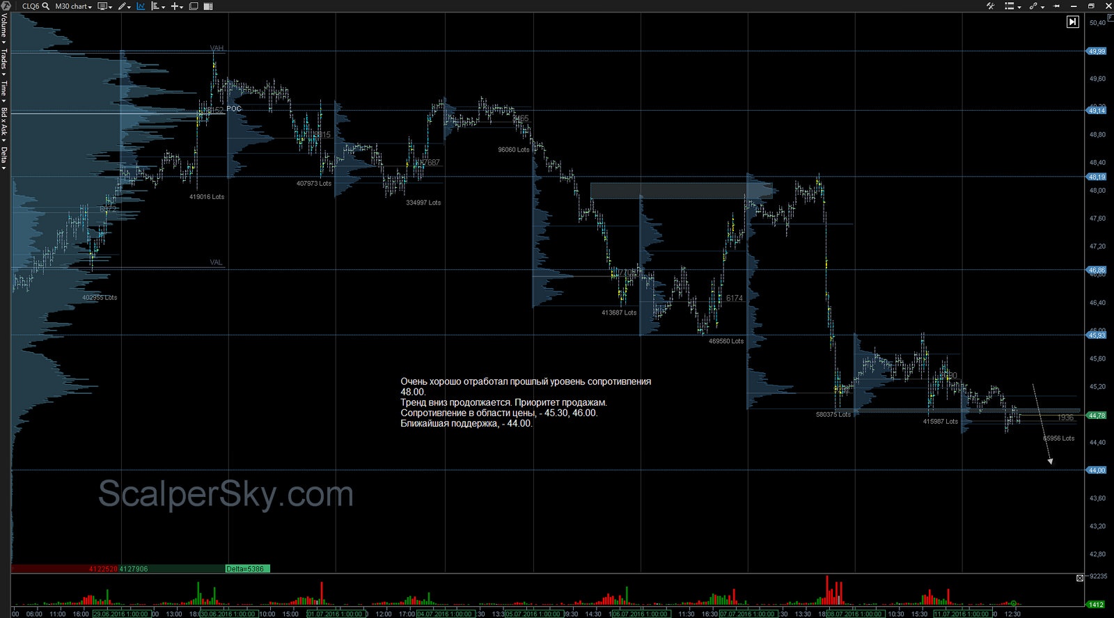 Начиная с понедельника, 18 июля, объем фьючерсов августа на нефть (CLQ6) перейдет на сентябрь (CLU6); это называется "Контрактный Ролл". Следуйтe правилам Торгового Комбайна и торгуйте контракт только с наибольшим объемом.