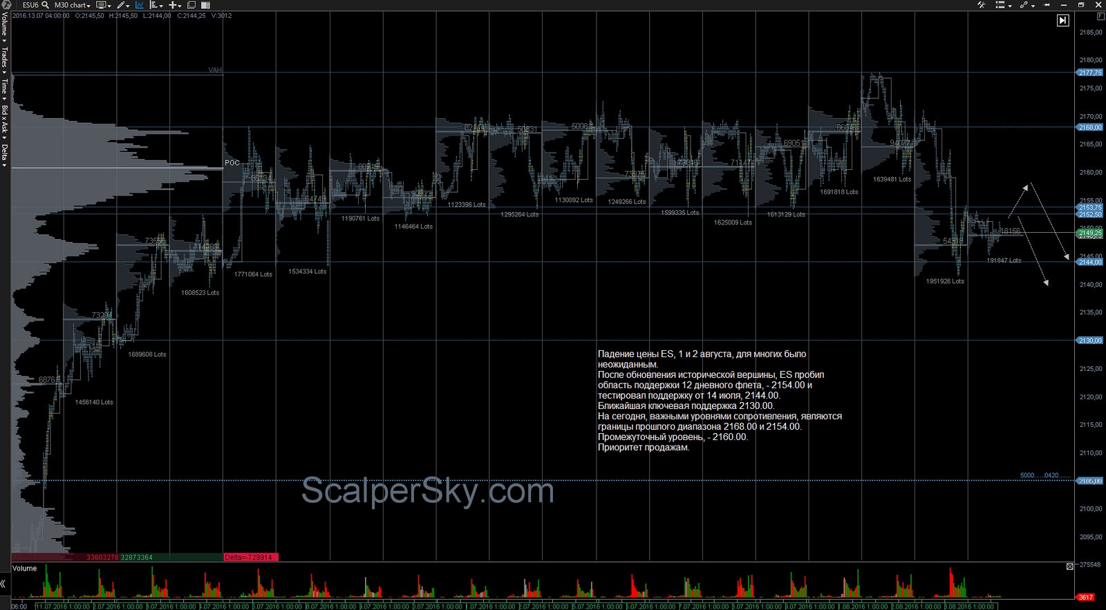 После обновления исторической вершины, ES пробил область поддержки 12 дневного флета, - 2154.00 и тестировал поддержку от 14 июля, 2144.00.