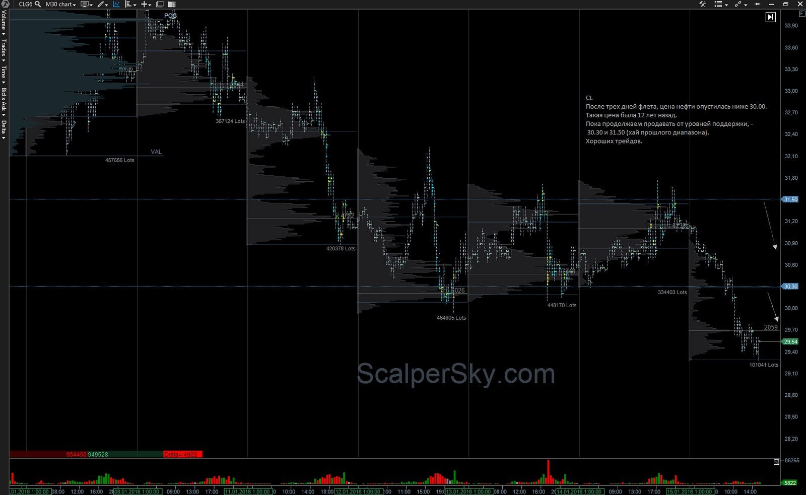Сегодня нефть покупают от уровня 29.40 (26.01.2016), после вчерашнего мощного удержания уровня 29.90 - 30.00, прошли очень большие объемы. Для внутридневных сделок, предлагаю обратить внимание на уровни:
