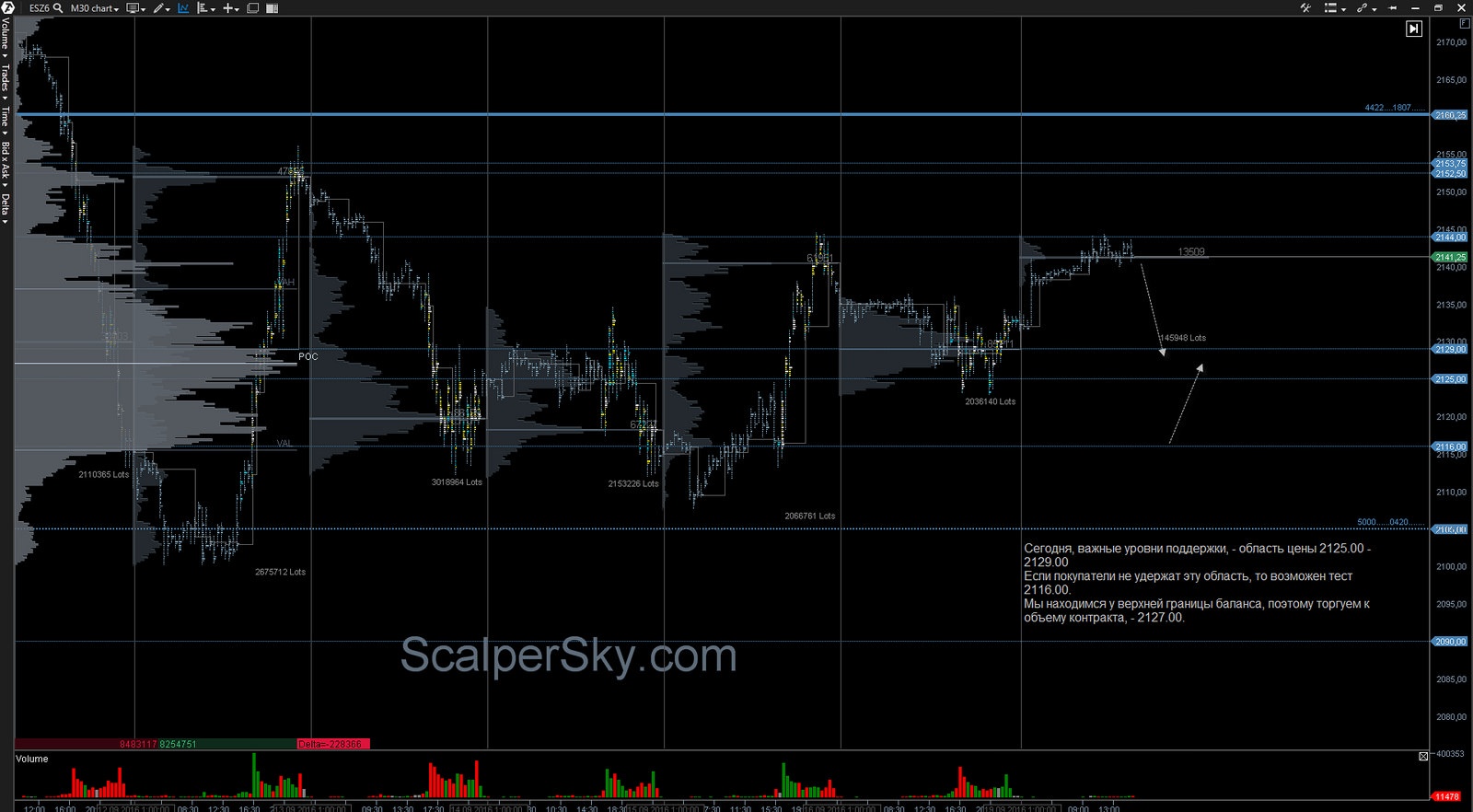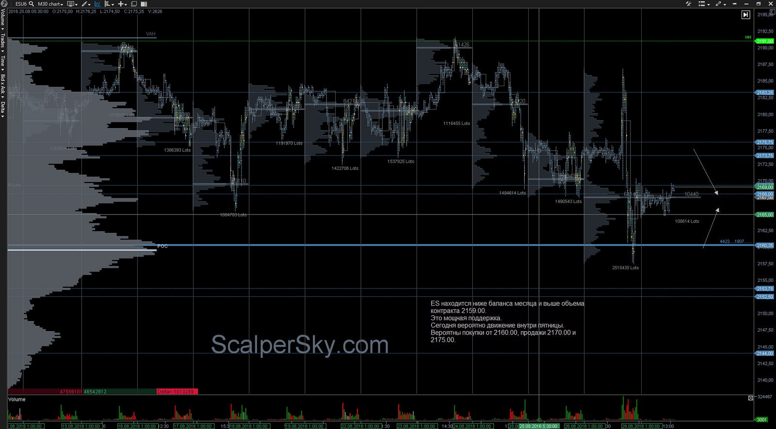 ES находится ниже баланса месяца и выше объема контракта 2159.00.