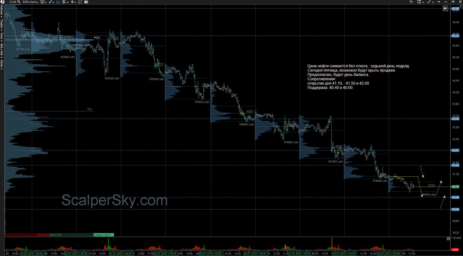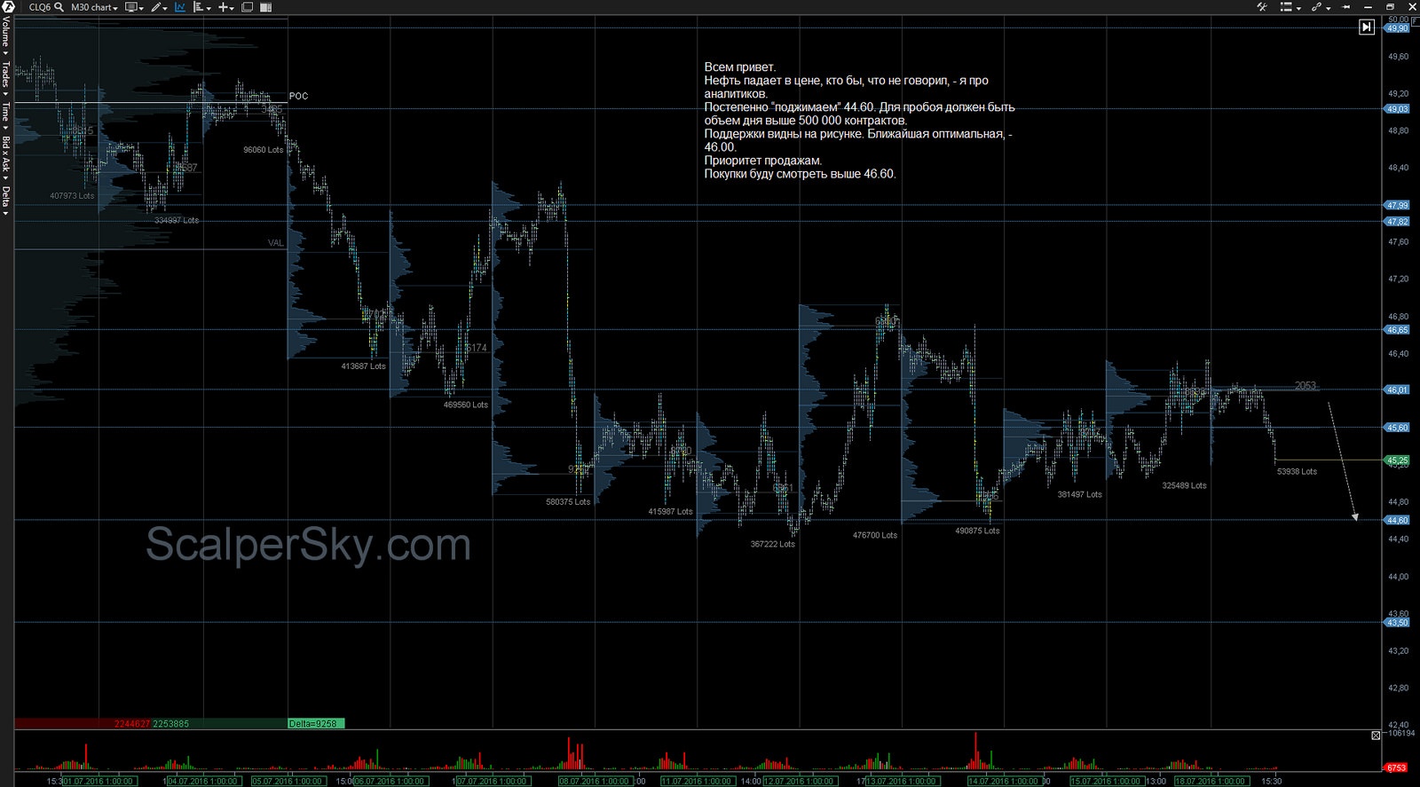 Постепенно “поджимаем” 44.60. Для пробоя должен быть объем дня выше 500 000 контрактов.