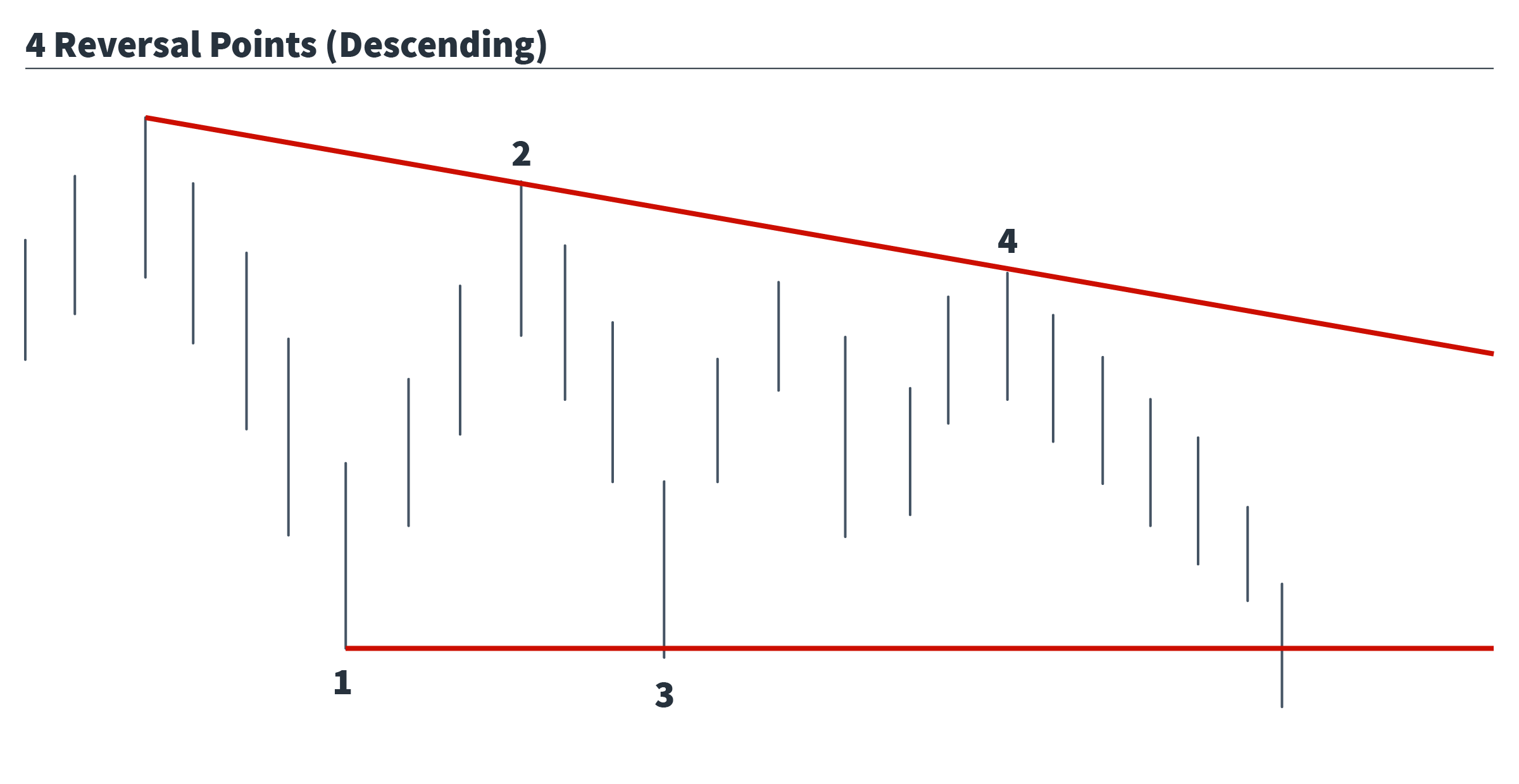 The descending triangle is a bearish chart pattern consisting of 2 trendlines converging towards an apex. In a descending triangle, the bottom line is horizontal, representing a typical support area, while the top line descends downwards, showing a series of lower highs. There must be a minimum of 4 reversal points in order for this to be considered a triangle pattern.