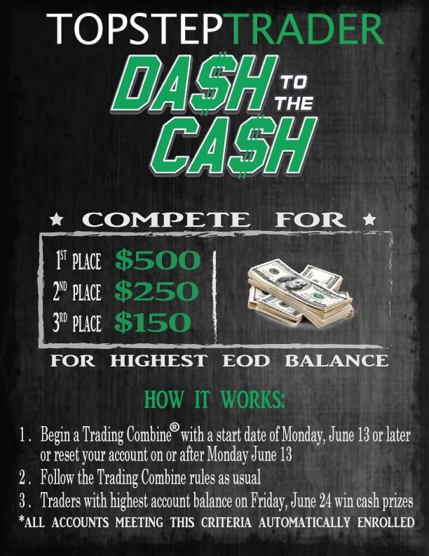 Join TopstepTrader’s "Dash to the Cash" contest for your chance to win a cash prize while working to earn a Funded Account® - bonus!