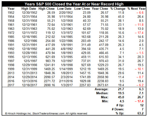 Below is a table of all the years the S&P 500 made a record high in December. There are 19 of them. The years following new December highs were not great, but not horrible, up 63.2% of the time (up 12, down 7) with an average gain of 6.3% and a median gain of 7.1%.